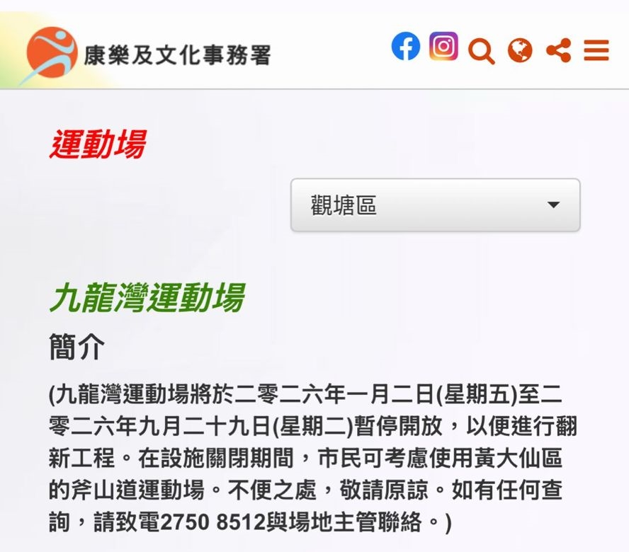 根據康文署發布消息,九龍灣運動場將於 2026年1月2日(星期五)至 2026年9月29日(星期二) 暫停開放,以便進行翻新工程。在設施關閉期間,署方建議市民可考慮使用鄰近黃大仙區的 斧山道運動場 繼續進行體育活動。如有任何查詢,市民可致電 2750 8512 與場地主管聯絡。